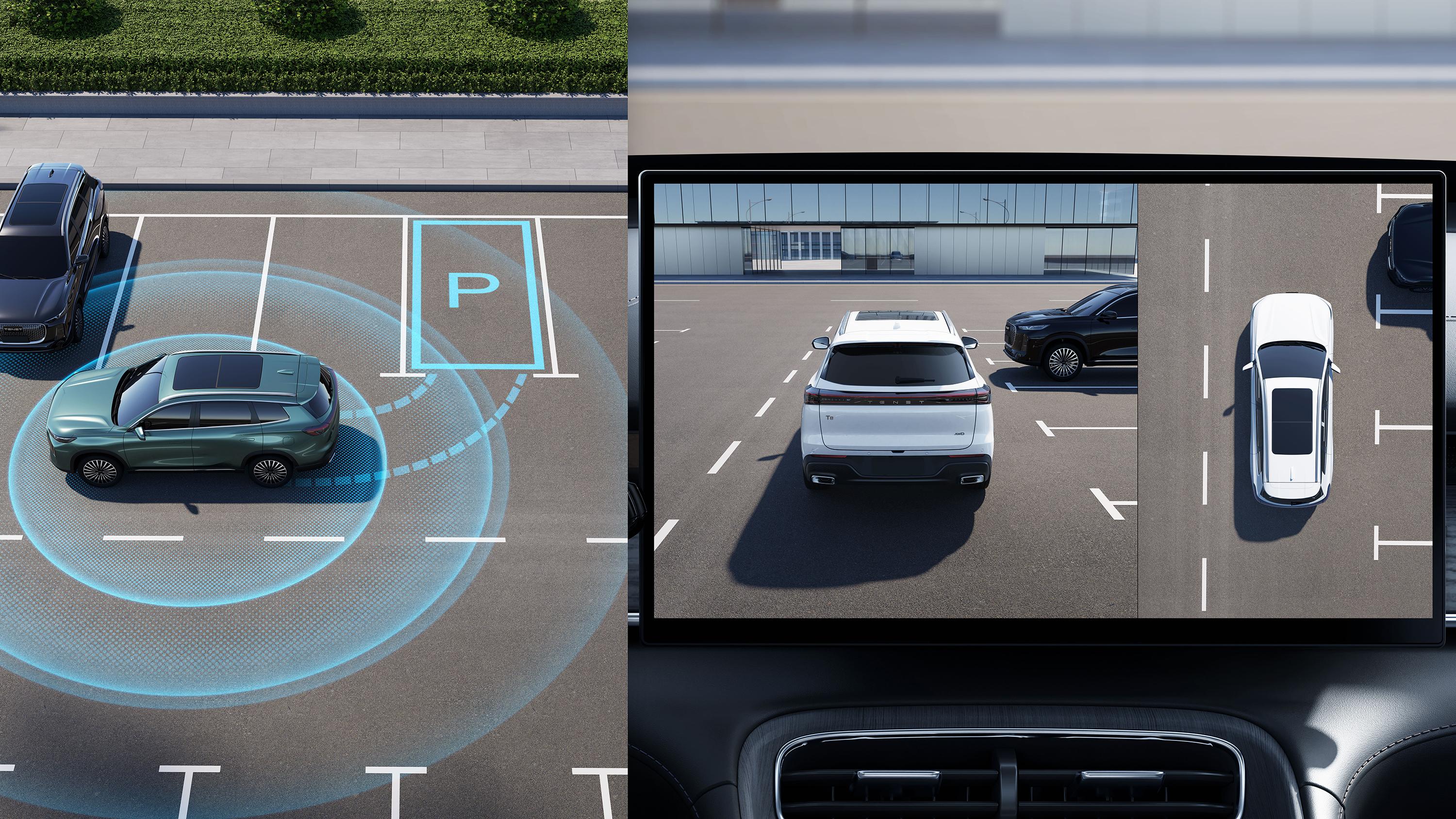 Камеры кругового обзора 540° — это набор видеокамер, установленных вокруг автомобиля Tenet, которые обеспечивают водителю полный обзор окружающей обстановки почти со всех сторон. На экране мультимедийной системы выводится изображение с разных камер, смонтированное в единое «панорамное» видео. Это помогает:
